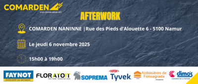 Le 6 novembre, de 15h à 19h, Comarden, votre spécialiste en matériaux de toiture, isolation et bois de charpente, vous invite à un Afterwork exceptionnel à Naninne ! Un moment convivial, en présence de nos fournisseurs et de l'Union des Couvreurs, dédié aux professionnels, placé sous le signe de l’innovation et du partage.